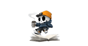 ドクロがコーヒーを片手に、本から飛び出してきたような一枚です。